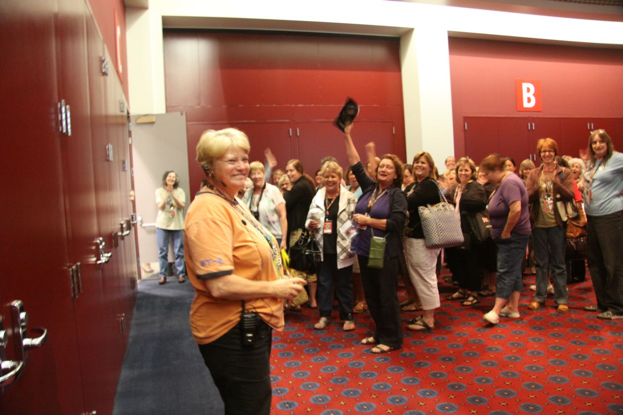 Knitters all lines up for our marketplace and Debbi, Steph and I leading them with 99 skeins of yarn.
