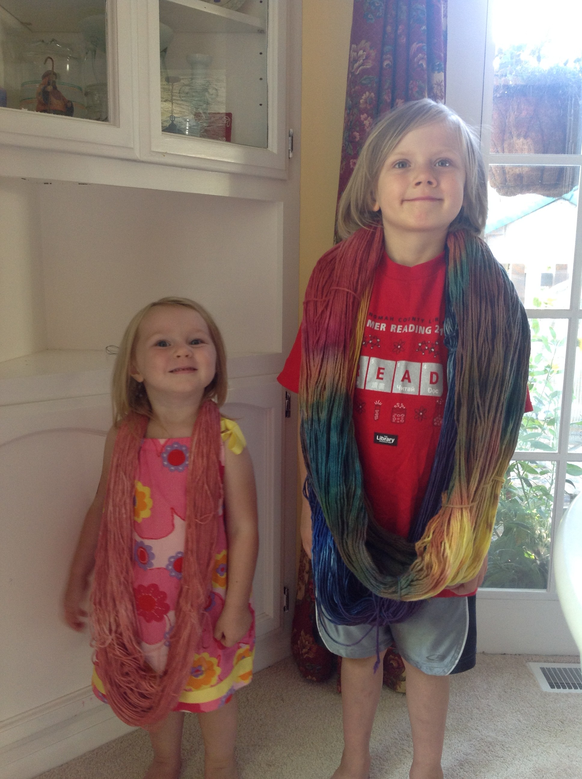 And just because…. our super cute duo of the day. My friend Linda has two of the most dear grandchildren, Ty and Clara, they are just a joy! Ty loves all things fiber arts related and I believe when he is just a little bit older is going to take the knitting world by storm. He calls me Tina Newton in the dearest way that just about does me in. Both Ty and Clara came to our dye day and played. Ty has been before and had a very clear and distinct vision for his yarn. He named them even!! Mountain Rainbow and Midnight Sunset. See…he’s gifted! And his little sis Clara is no slouch either look at that pink she has there. She calls her colorway Happy. Ty thought maybe Pink before you Wink would be good name for hers. It’s a great name and now, thanks to dear Ty and Clara, in the beginning of the Fall season, I am going to have to come up with a Pink before you Wink colorway!