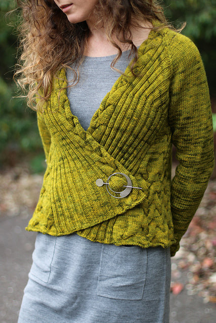 It’s Carol Feller’s Landscape Waves in our Targhee Worsted in one of my very favorite color ways Spawn of Scum! Carol and I have similar tastes in color ways which is alway nice. I have as much of a love affair going for this sweater as I do for Sookie. I love the cables and how they frame the rib and how it all comes together in this poem of a cardigan. You can purchase Carol pattern directly from her.