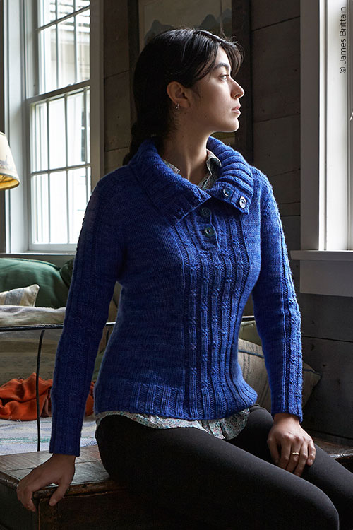Caldera designed by one of Blue Moon’s dear friends, the talented and very clever Sandi Rosner, is a stunning pullover with exquisite detail work in the ribbing and what looks to be the coziest of button down cowl collars. I love the detail on the ribbing and how flattering the shaping is. The colorway’s not to shabby either. Sandi used our luxurious Gaea in the colorway Blue for Ewe. Seeing Caldera in Blue for Ewe makes me wish I looked better in blues. I was pretty excited when Sandi told me she was designing something for Twist with my Gaea and now that I have seen Caldera in all of her glory I am beyond thrilled. Hmmm…what color to dye to this lovely piece for me? Maybe Grimm Green? Adding a little green to blue usually works for me. Caldera Photo Credit: Jame Brittain